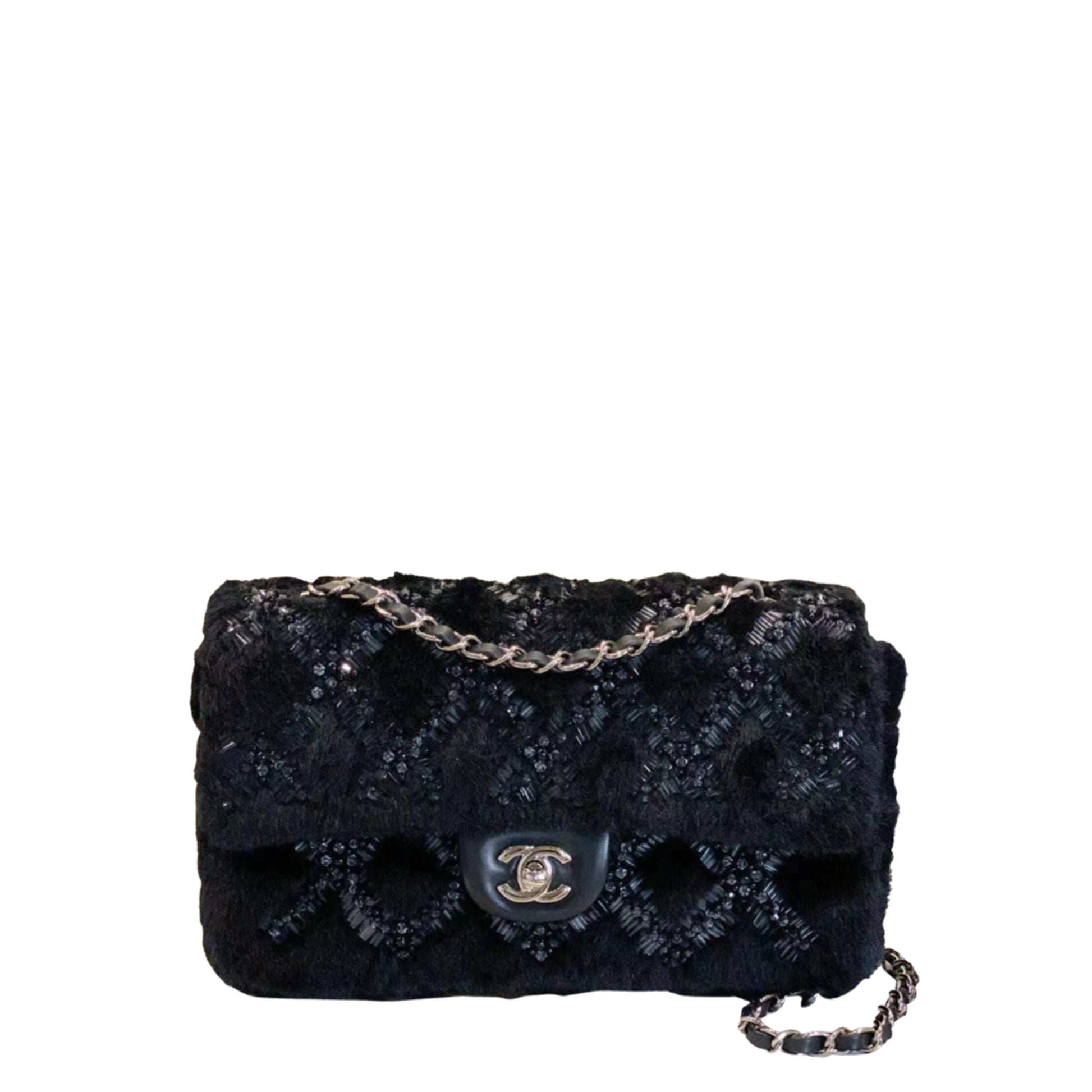 BOLSO CON TELA DE PELUCHE DELICADO BORDADO EN BRILLOS Y CADENA, BROCHE DE LA MARCA EN EL FRONTAL COLOR PLATEADO