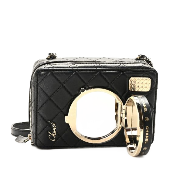 Bolso de piel negro con silueta de cámara fotográfica. Colección primavera-verano.