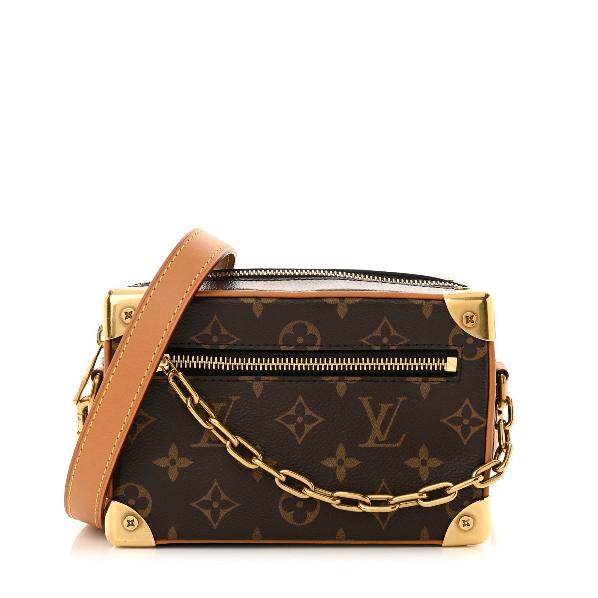Este minibaúl de Louis Vuitton es una pieza de lujo única con un estilo reconocible. Destaca en una lona clásica con el monograma de Louis Vuitton en marrón. Está equipado con una correa de vachetta, herrajes de oro envejecido y eslabones de cadena dorada. El interior de tela marrón cuenta con un bolsillo de parche para guardar los elementos esenciales. Encontrarás un equilibrio ideal de moda y funcionalidad con este lujoso minibaúl.