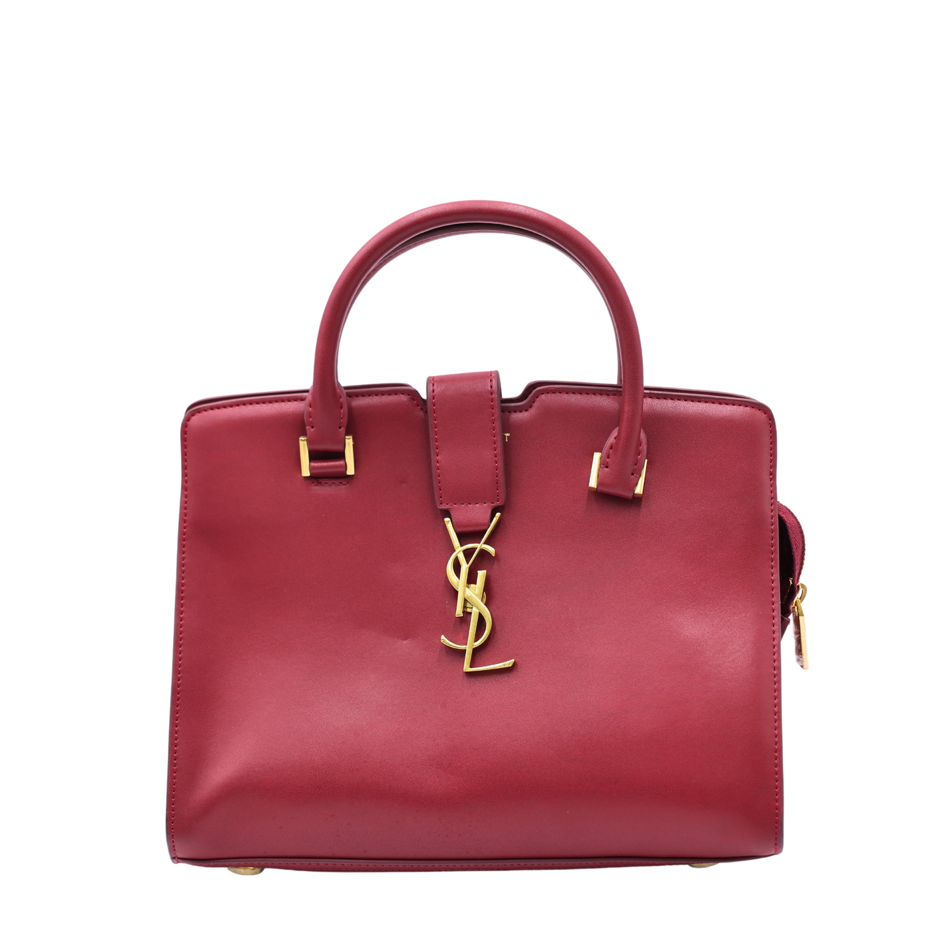 Este Cabas pequeño de SAINT LAURENT te hará lucir elegante con su tono vinotinto. Hecho de cuero de becerro suave y liso, presenta asas superiores enrolladas, una correa cruzada con un logotipo de monograma YSL y una cremallera superior para asegurar tus pertenencias. Combina la moda y la funcionalidad con este bolso tote clásico.