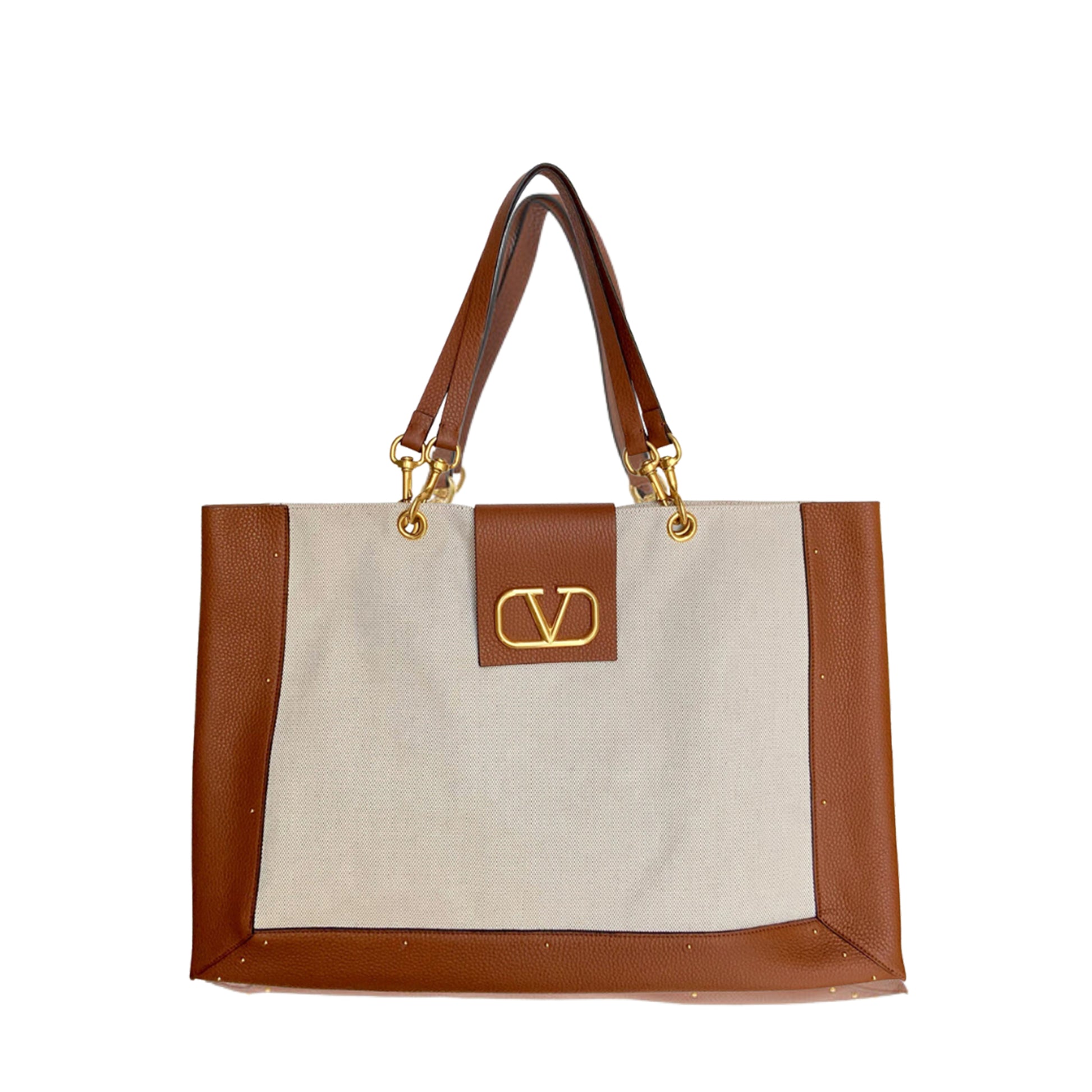 BOLSO DE TELA CON DETALLES EN CUERO MARRÓN Y LOGOTIPO EN DORADO