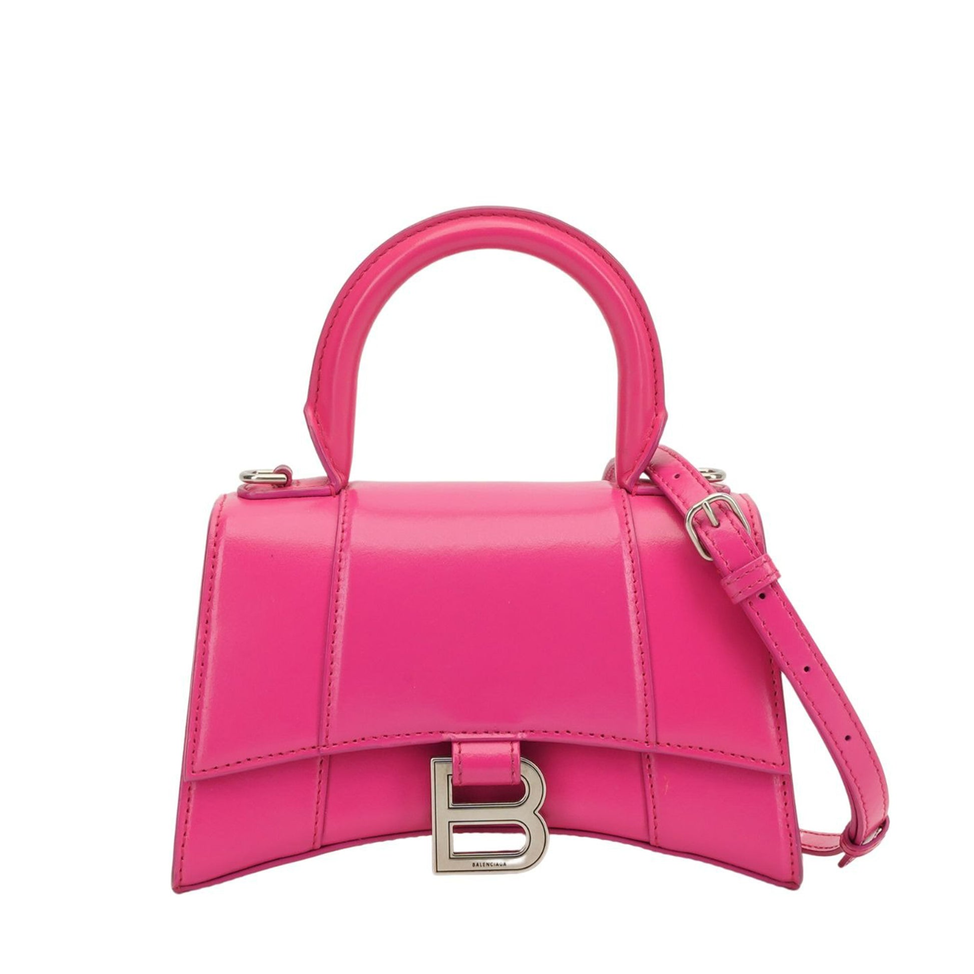 CARTERA MEDIANA ¨HOURGLASs¨ DE PIEL FUCSIA, UN ASA EN LA PARTE SUPERIOR, CORREA DE PIEL AJUSTABLE Y EXTRAIBLE, CIERRE MAGNETICO, HEBILLA CON LOGOTIPO ¨B¨ DE LA FIRMA