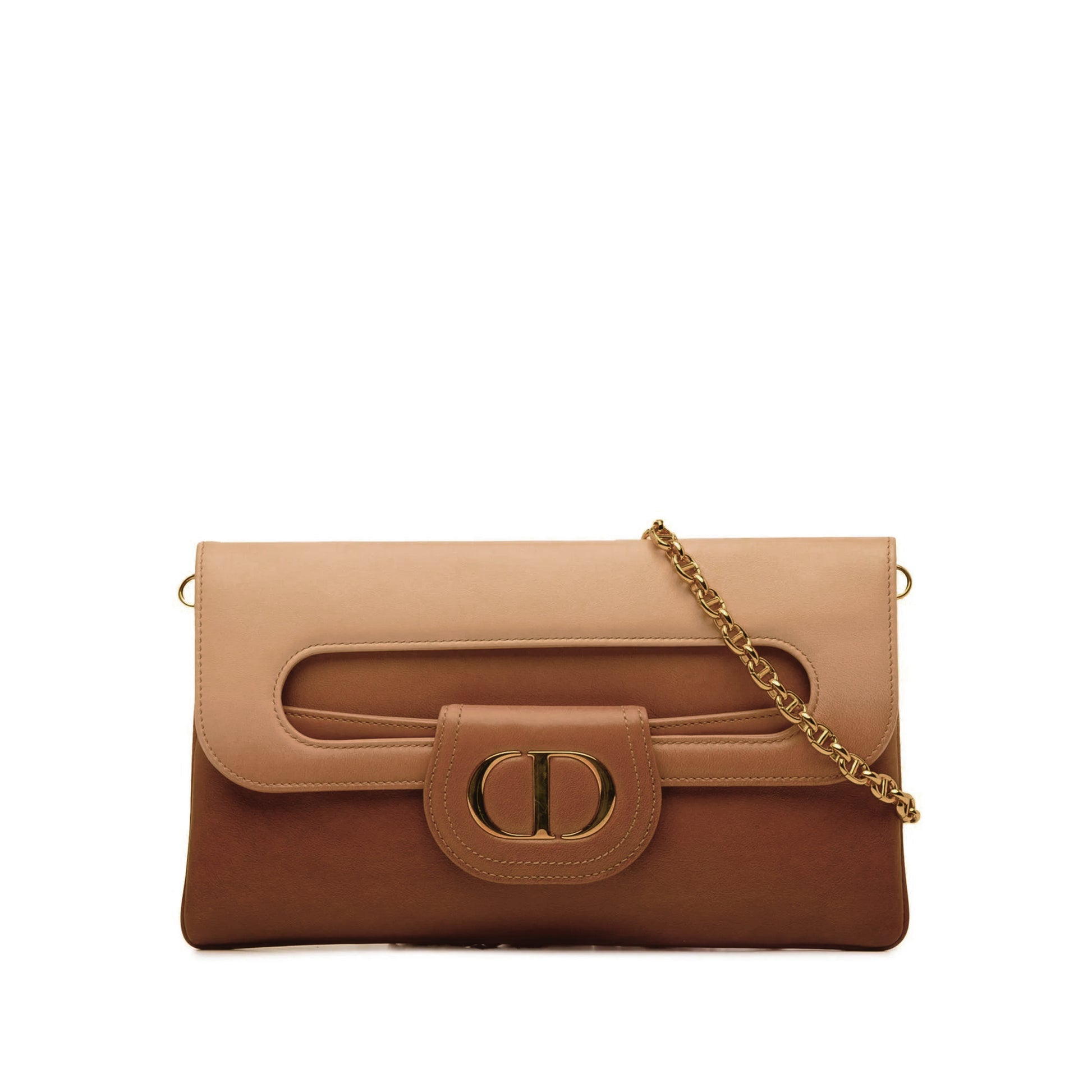 CARTERa ¨DOUBLE¨ EN PIEL MARRON, SOLAPA SIMETRICA CON UN CIERRE DE IMAN ¨CD¨ EN METAL, CORREA DE CADENA EXTRAIBLE CONVIRTIENDOLA EN SOBRE DE MANO.