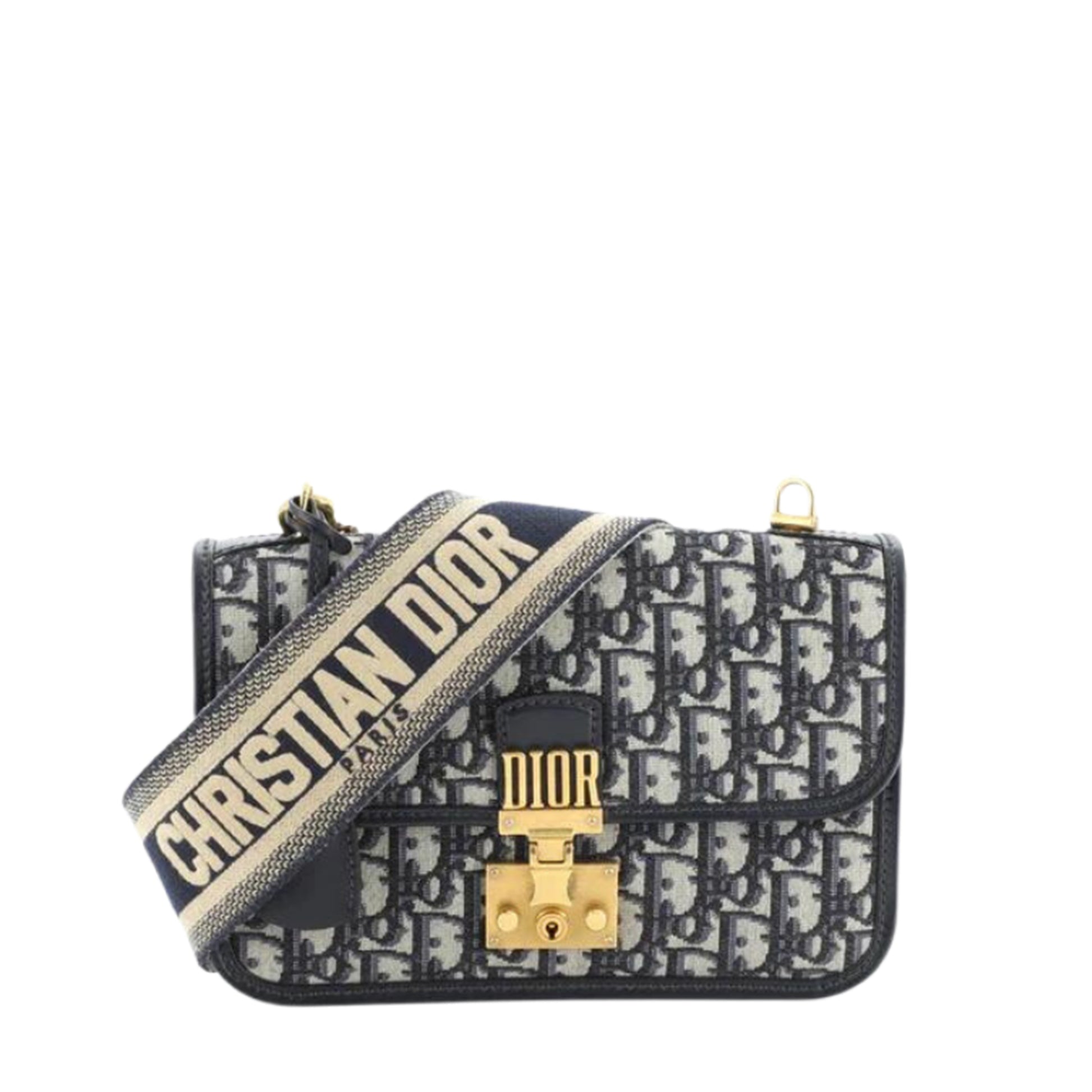 CARTERA ¨DIORADDICT¨ DE LONA BORDADO DIOR OBLIQUE AZUL, CIERRE CON BOTON A PRESION, HEBILLA DIOR DECORATIVA PEQUEÑA EN LA PARTE FRONTAL, CORREA AJUSTABLE Y EXTRAIBLE