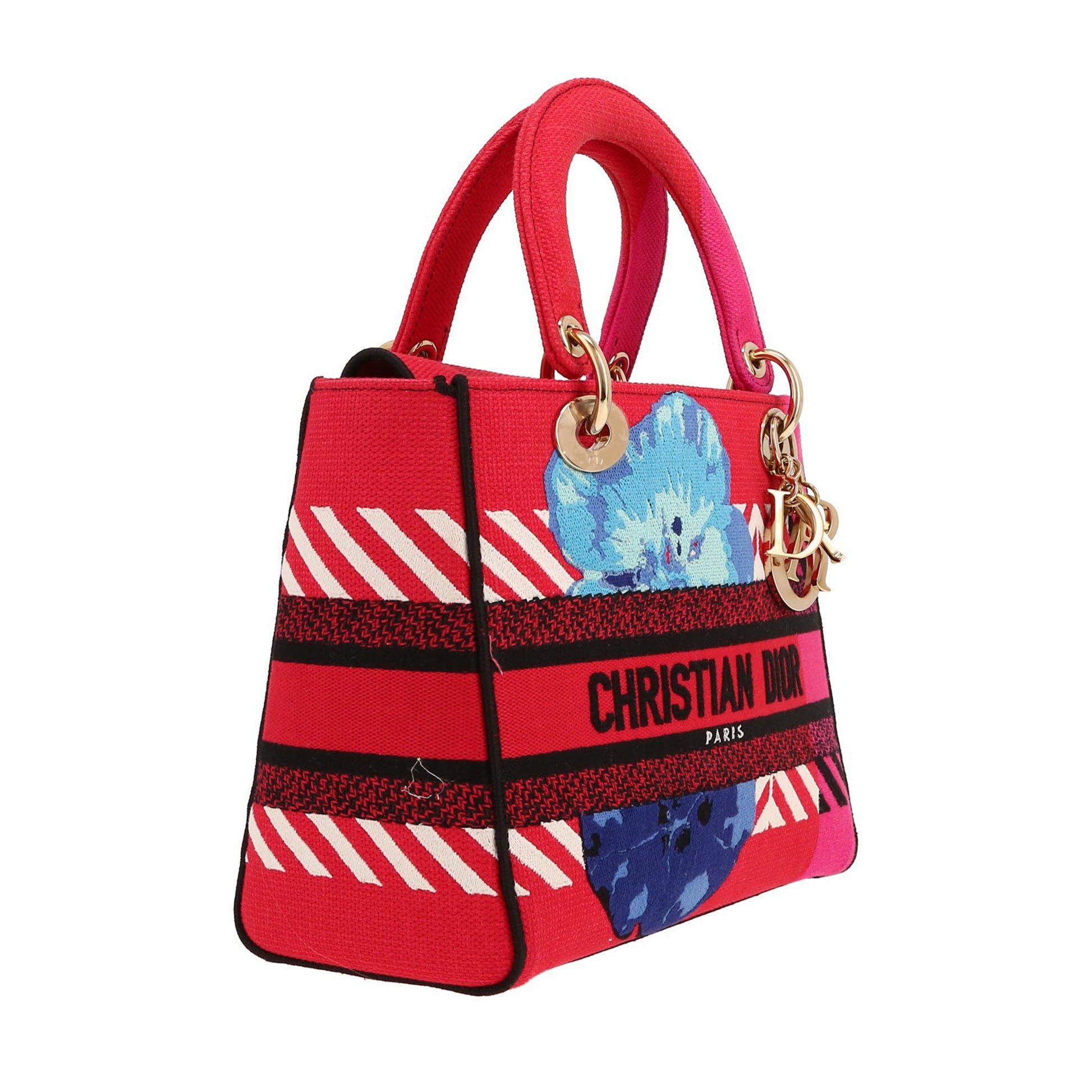 CARTERA ¨LADY D-LITE¨ BORDADO CON MOTIVO FLOREAL MULTICOLOR, DOBLE ASA, CORREA EXTRAIBLE, ACCESORIO COLGANTE ¨DIOR¨ DE METAL Y BORDADO EN LOGO TIPO DE LA FIRMA EN LA PARTE DELANTERa