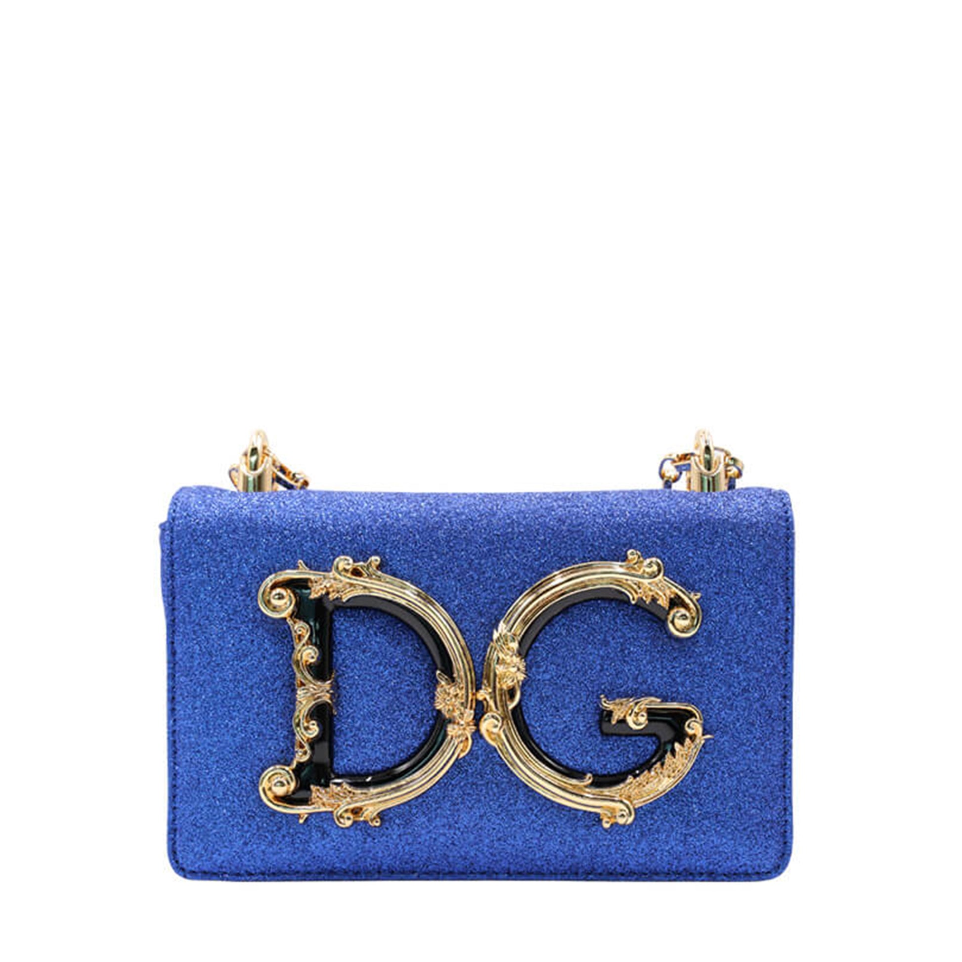 CARTERA PEQUEÑA ¨DG GIRLS¨ EN COLOR AZUL, CIERRE INVISIBLE DE IMAN, CORREA DE CADENA DESLIZANTE, MAXI LETRAS ¨DG¨ EN DORADO EN LA PARTE DELANTERA.