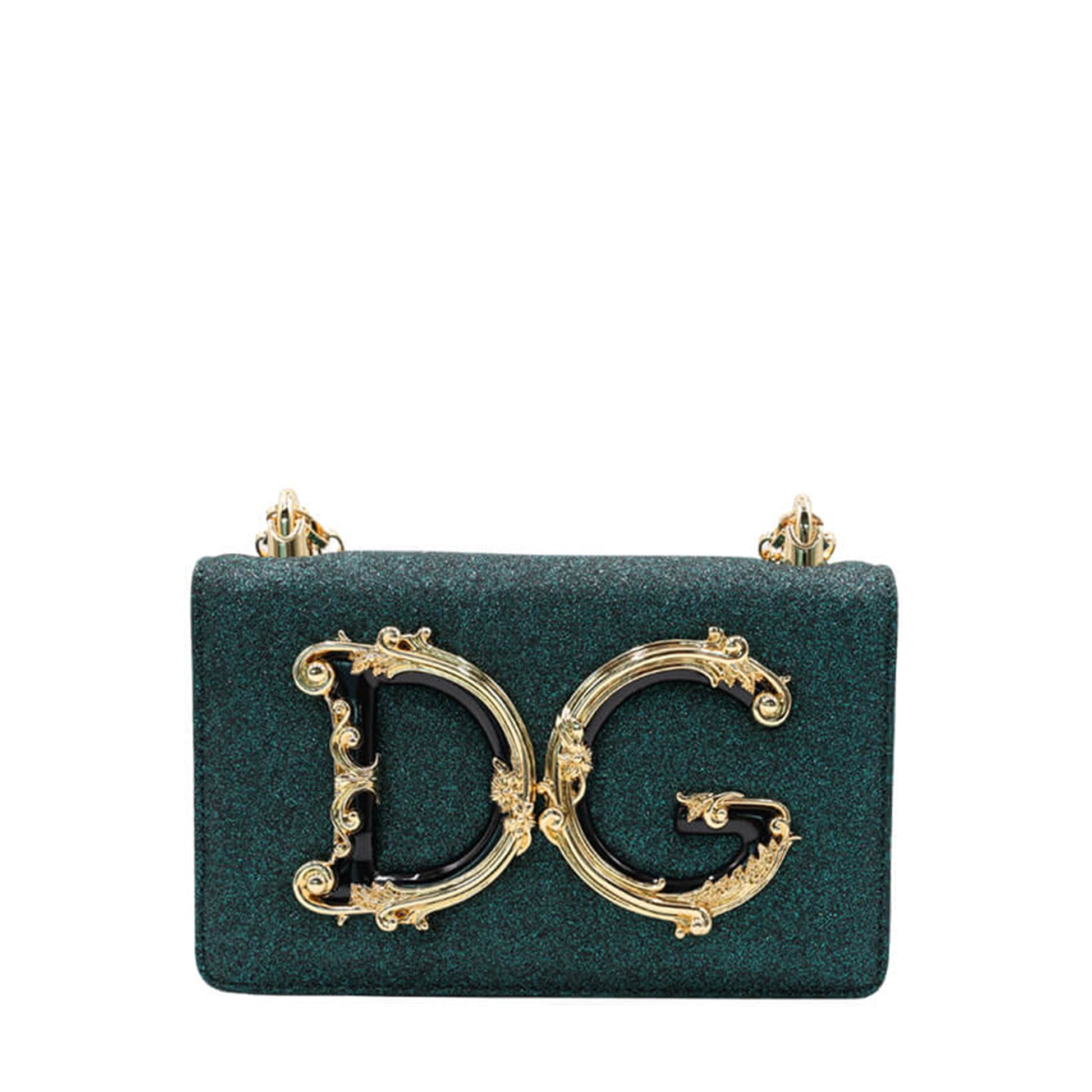 CARTERA PEQUEÑA ¨DG GIRLS¨ EN COLOR VERDE BRILLANTE, CIERRE INVISIBLE DE IMAN, CORREA DE CADENA DESLIZANTE, MAXI LETRAS ¨DG¨ EN DORADO EN LA PARTE DELANTERA.