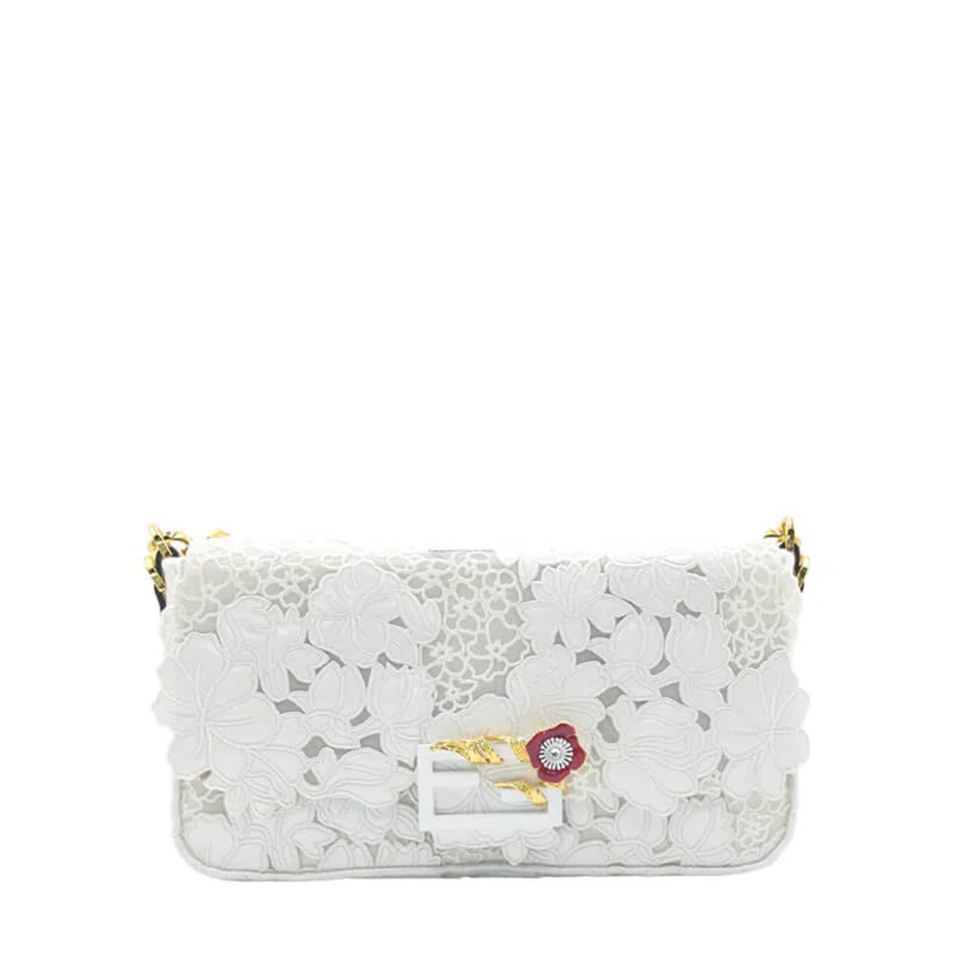 CARTERA ¨BAGUETTE¨ BORDADO EN BLANCO, CORREA EXTRAIBLE, CIERRE DE BOTON MAGNETICO Y HEBILLA EN SOLAPA DELANTERa ¨FF¨