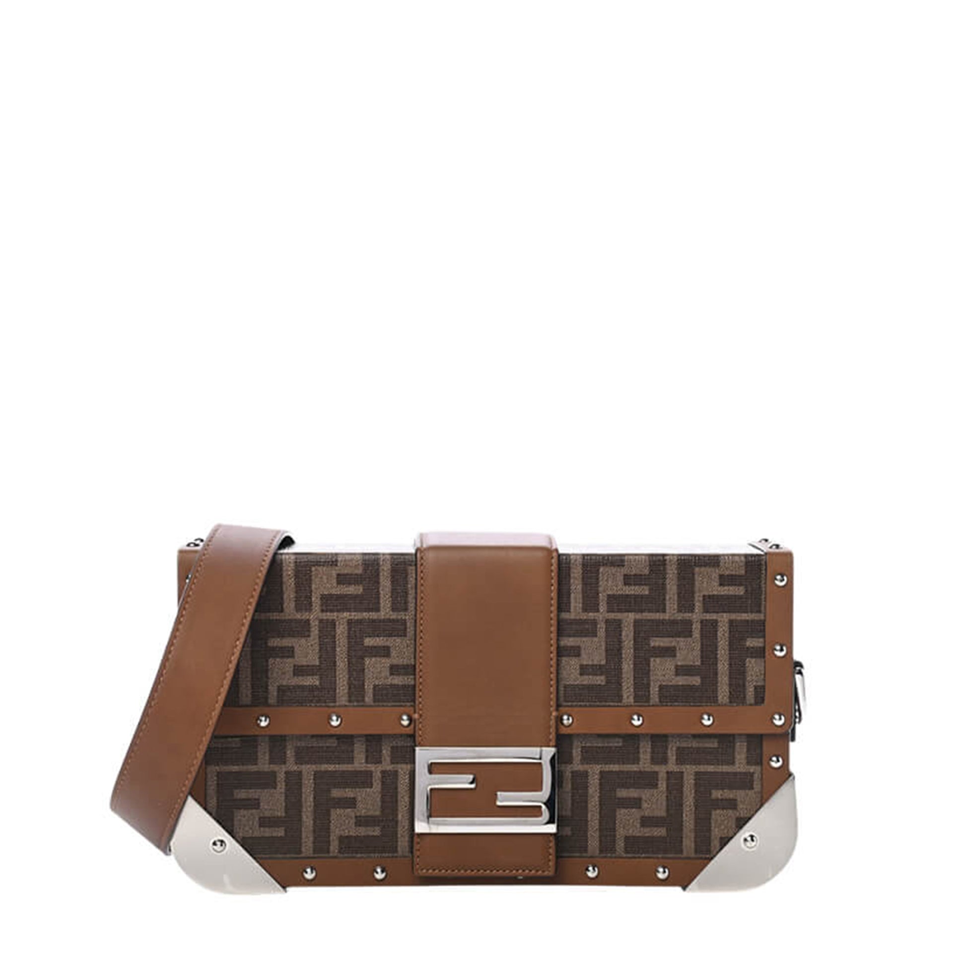 CARTERA ¨BAGUETTE¨ EN LONA MARRON CON MOTIVO ¨FF¨, CORREA DE PIEL EXTRAIBLE, CIERRE DE BOTON MAGNETICO Y HEBILLA EN SOLAPA DELANTERa ¨FF¨