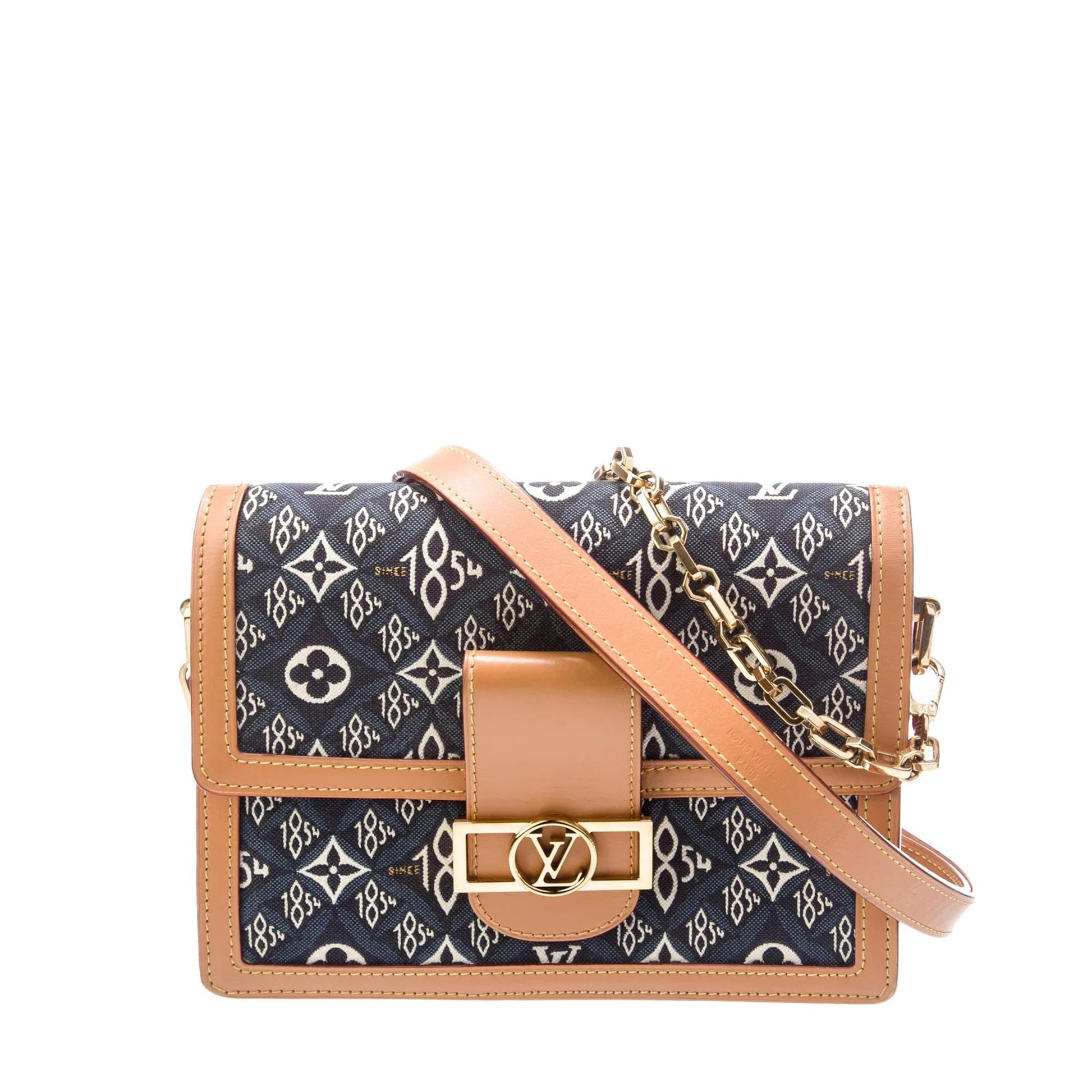 CARTERA ¨DENIM DAUPHINE¨ 1854 SIMULANDO LA TELA DE JEANS, CORREA DE PIEL, CIERRE A PRESION CON HEBILLA PEQUEÑA LV DE LA FIRMA