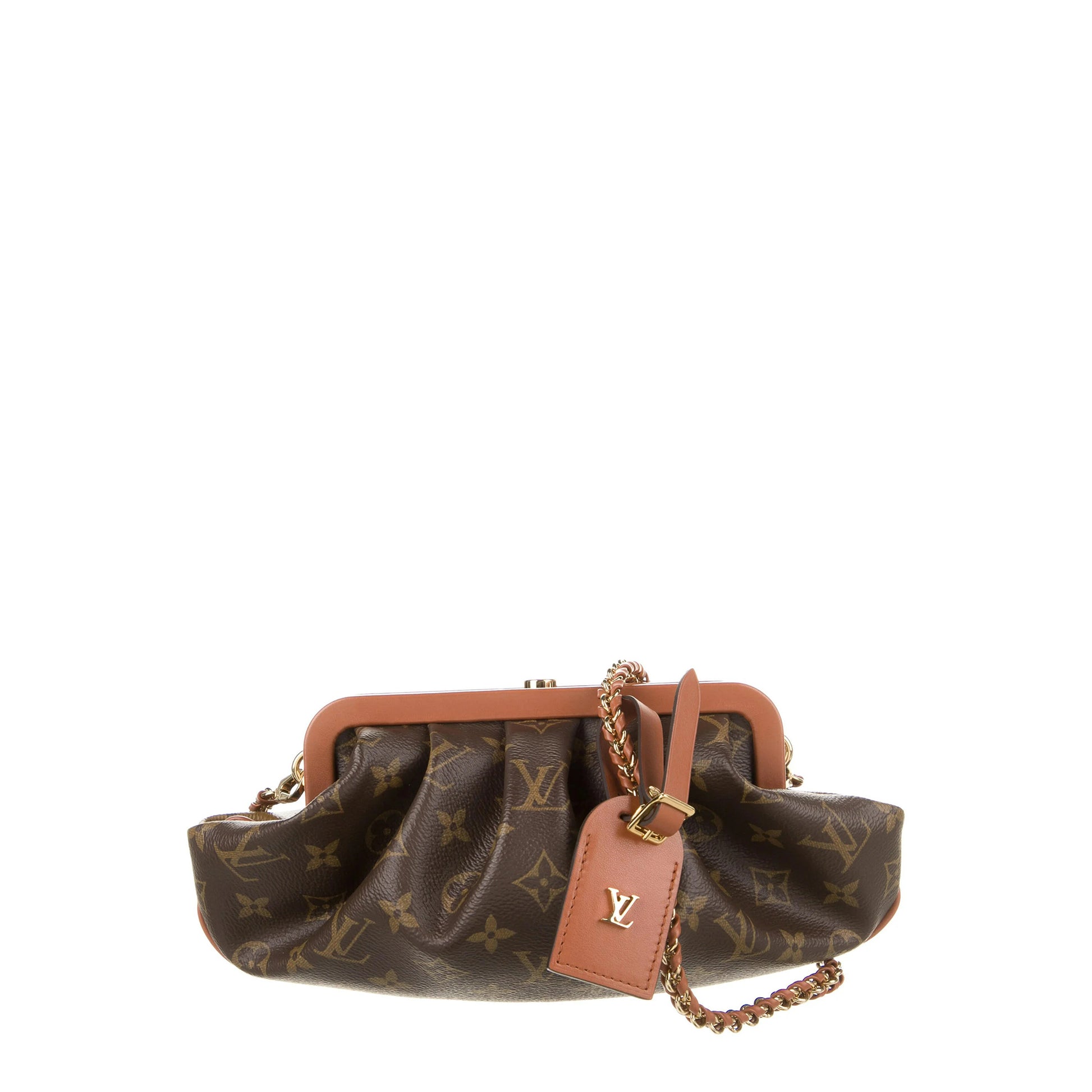 CARTERA DE INSPIRACION VINTAGE ¨BOURSICOT EW¨ MARRON CON MONOGRAMA CLASICO DE LA FIRMA, CORREA DE CADENA Y PIEL EXTRAIBLE PARA LLEVARLA DE HOMBRO O CRUZADA. CIERRE DE BOTON EN LA PARTE SUPERIOR, Y LLAVERO DE PIEL COMO ACCESORIO