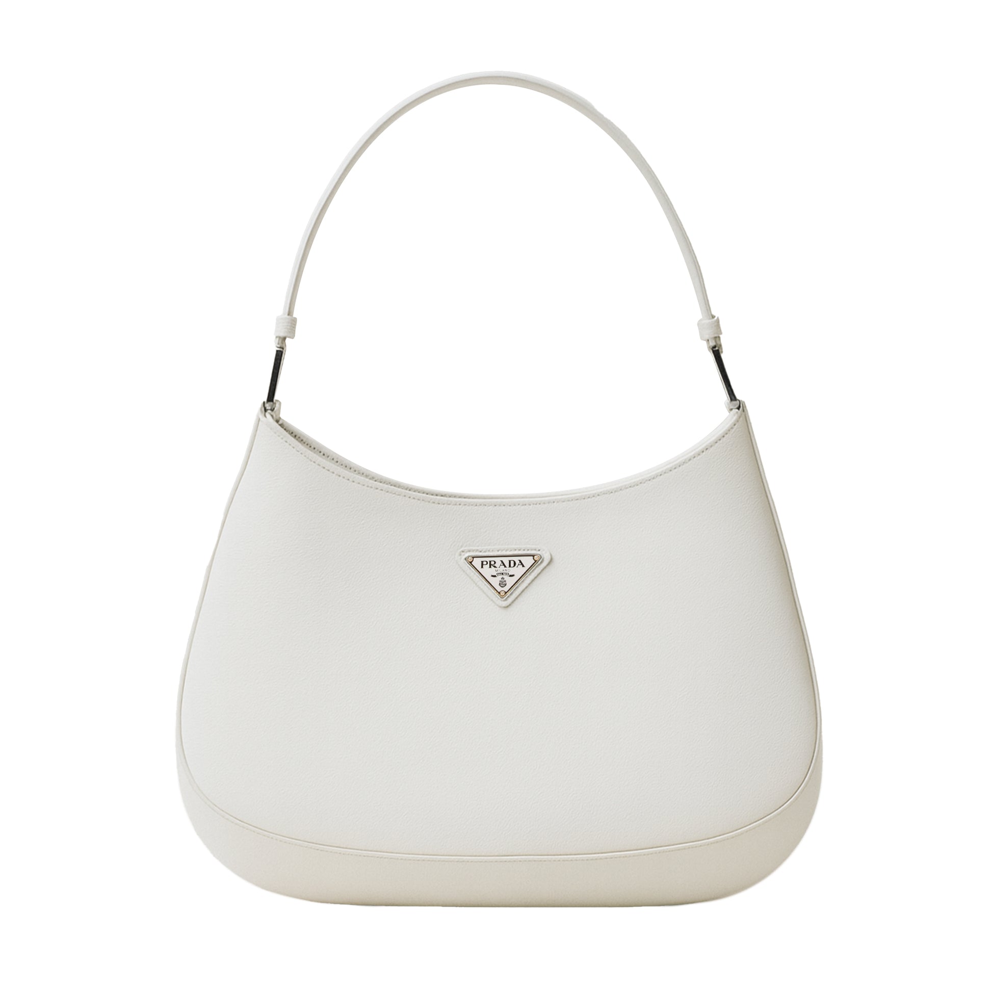 CARTERA ¨CLEO¨ EN PIEL BLANCO, ASA SUPERIOR DE PIEL, CIERRE MAGNETICO Y HEBILLA LOGOTIPO TRIANGULAR DE LA FIRMA