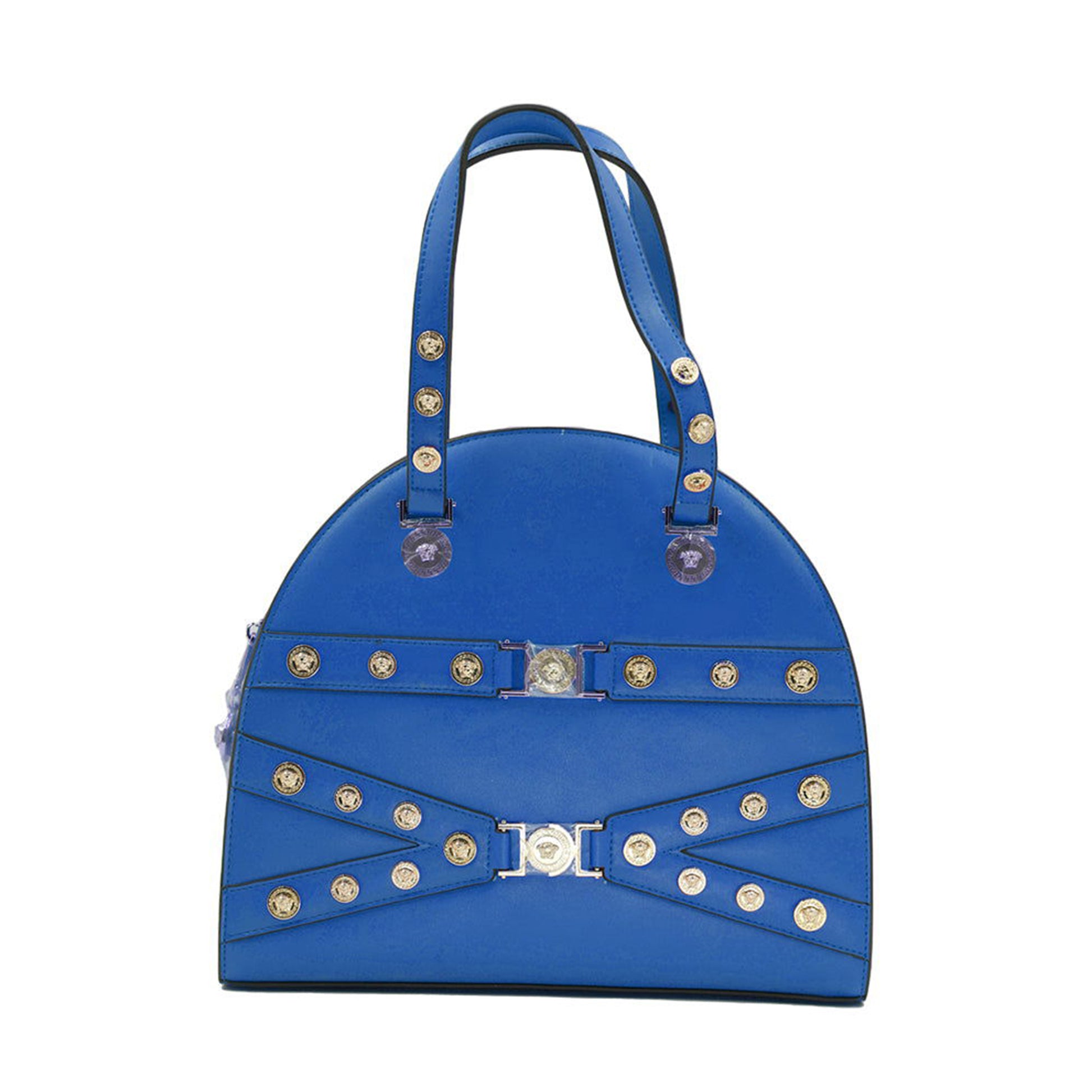 CARTERA ¨TRIBUTE MEDALLION¨ EN PIEL AZUL, CIERRE DE CREMALLERA, DOBLE ASA EN PIEL, CORREA EXTRAIBLE Y AJUSTABLE EN PIEL, TACHUELAS MEDIANAS Y PEQUEÑAS ¨MEDUSA¨ QUE ADORNAN TODA LA CARTERA