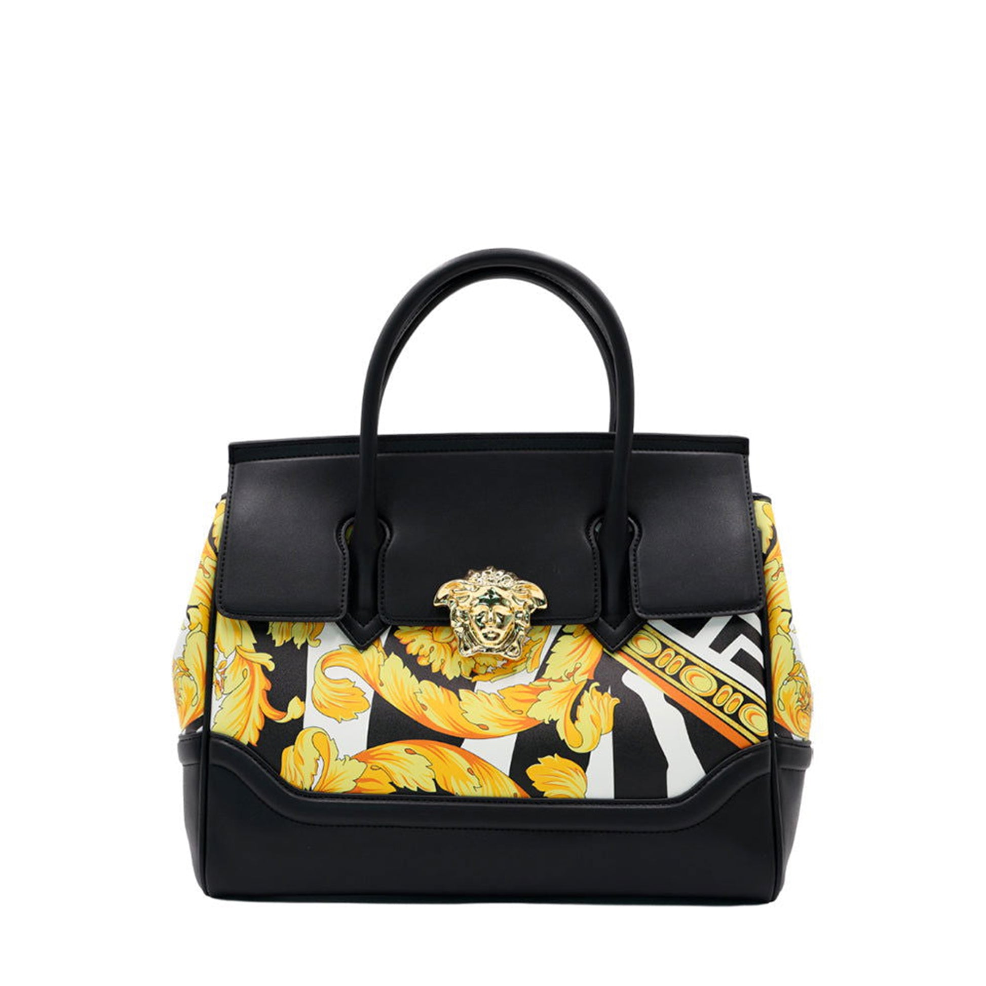 CARTERA LA ¨MEDUSA¨ EN PIEL NEGRO EN LA PARTE SUPERIOR E INFERIOR, EN EL MEDIO PRINT BARROCO, CON CORREA EXTRAIBLE Y DOBLE ASA EN LA PARTE SUPERIOR, CIERRE EN LA SOLAPA DELANTERA CON HEBILLA DORADA PEQUEÑA ¨MEDUSA¨ CARACTERISTICO DE LA FIRMA