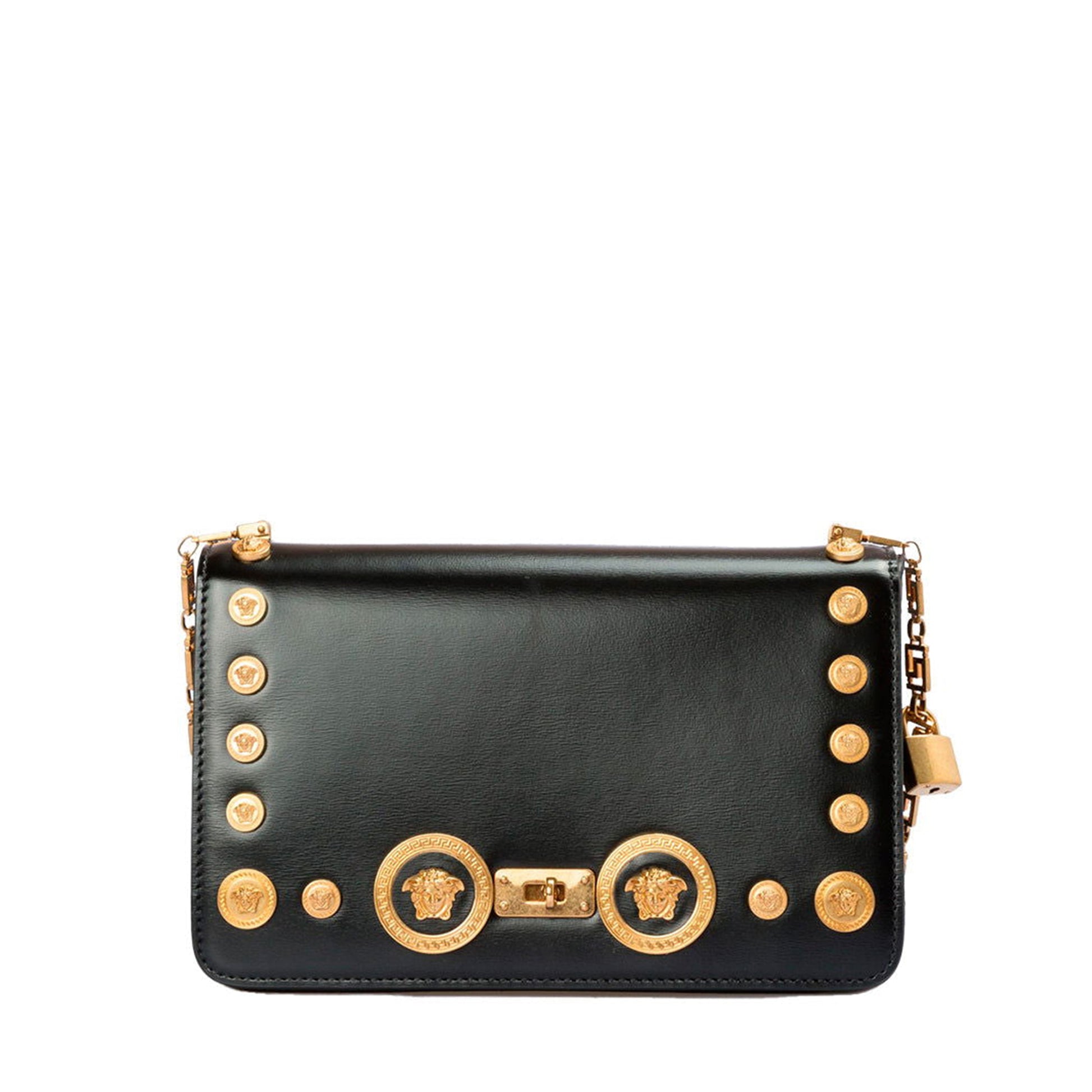 CARTERA DE PIEL NEGRO, CORREA DE CADENA DESLIZANTE, 2 HEBILLAS PEQUEÑAS ¨MEDUSA¨ Y CIERRE DE SEGURIDAD GIRATORIO