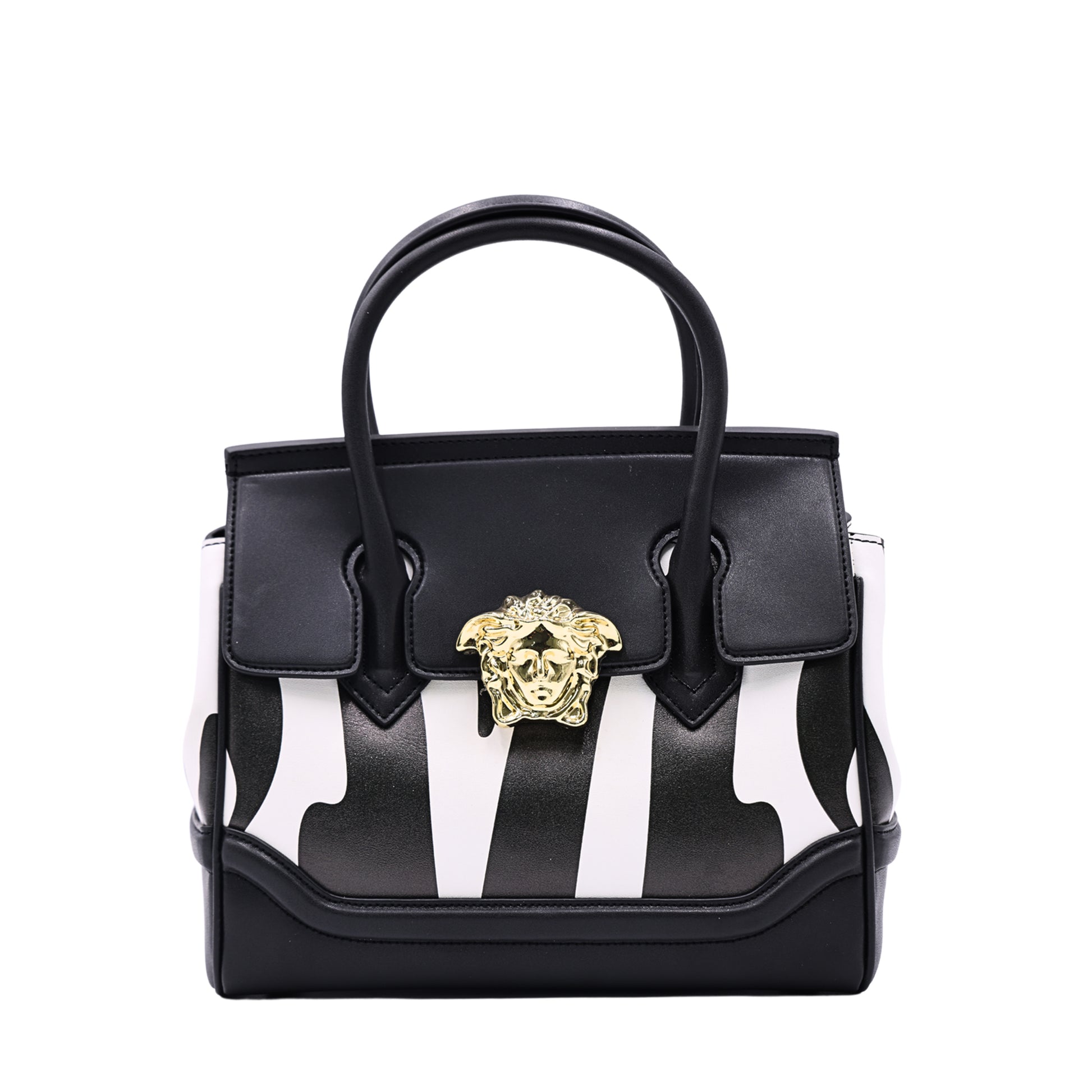 CARTERA LA ¨MEDUSA¨ EN PIEL NEGRO EN LA PARTE SUPERIOR E INFERIOR, EN EL MEDIO ANIMAL PRINT BLANCO Y NEGRO, DOBLE ASA EN LA PARTE SUPERIOR, CIERRE EN LA SOLAPA DELANTERA CON HEBILLA DORADA PEQUEÑA ¨MEDUSA¨ CARACTERISTICO DE LA FIRMA