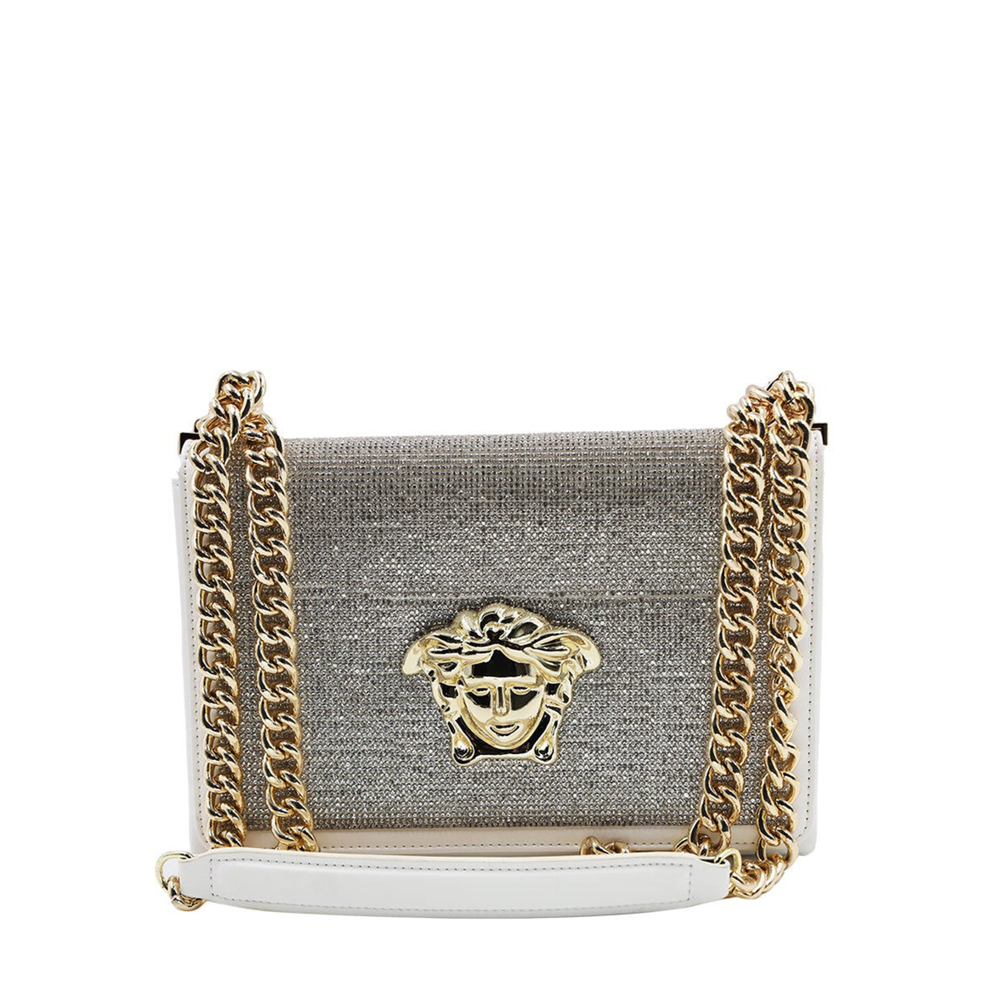 CARTERA LA ¨MEDUSA¨ EN PLATEADO BRILLANTE TIPO COFRE, CON CORREA DE CADENA DESLIZANTE Y EN LA SOLAPA DELANTERA HEBILLA DORADA GRANDE ¨MEDUSA¨ CARACTERISTICO DE LA FIRMA