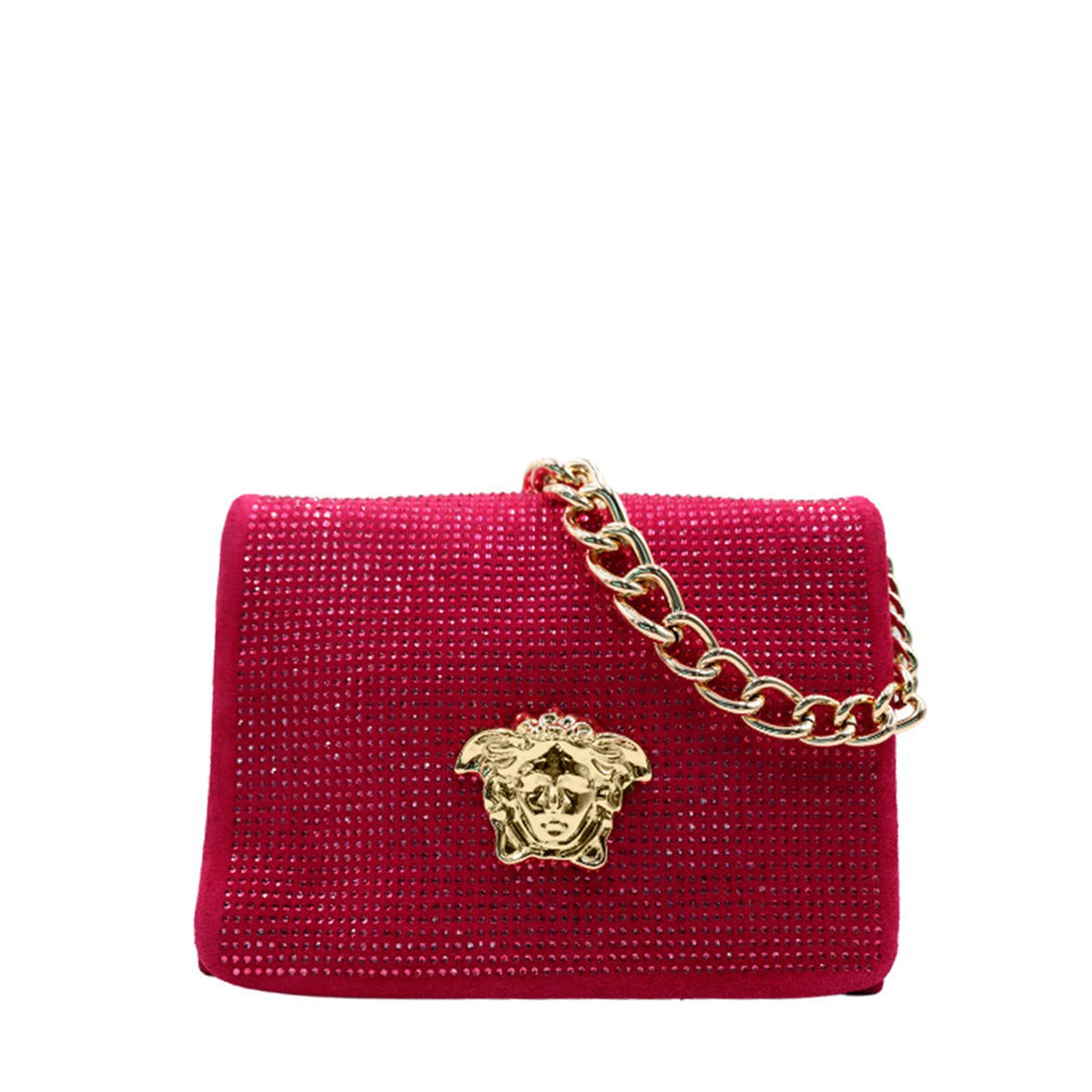 CARTERA LA ¨MEDUSA¨ EN ROJO BRILLANTE TIPO COFRE, CON CORREA DE CADENA DESLIZANTE Y EN LA SOLAPA DELANTERA HEBILLA DORADA GRANDE ¨MEDUSA¨ CARACTERISTICO DE LA FIRMA