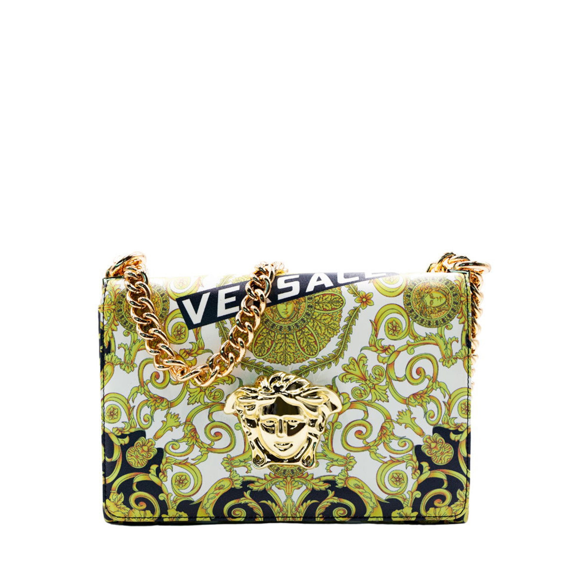 CARTERA LA ¨MEDUSA¨ TIPO SOBRE MULTICOLOR PRINT BARROCO, CON CORREA DE CADENA DESLIZANTE Y EN LA SOLAPA DELANTERA HEBILLA DORADA GRANDE ¨MEDUSA¨ CARACTERISTICO DE LA FIRMA