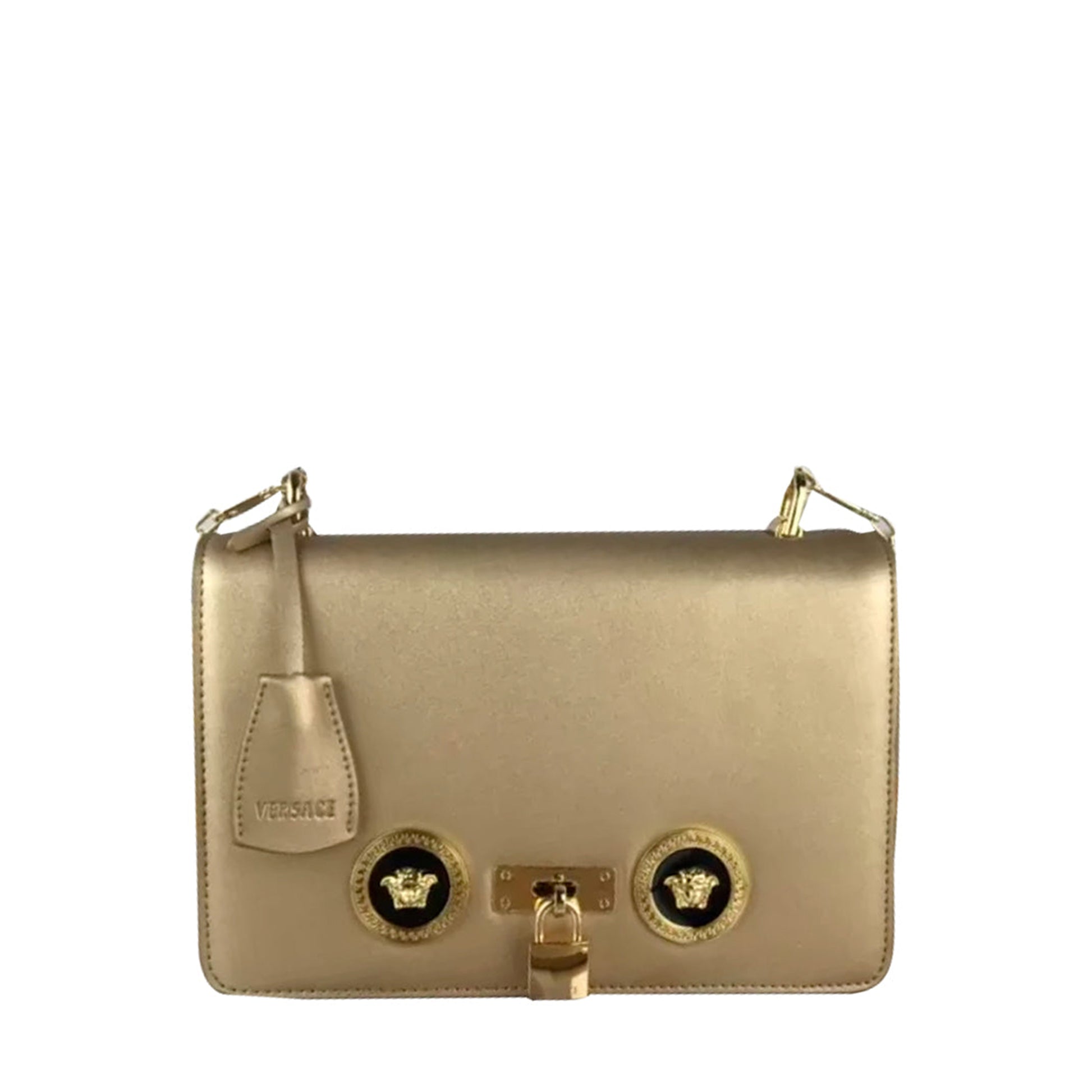 CARTERA DE PIEL DORADO, CORREA DE CADENA DESLIZANTE, LLAVERO EN PIEL COLGANTE, 2 HEBILLAS PEQUEÑAS ¨MEDUSA¨ Y CIERRE DE SEGURIDAD CON CANDADO