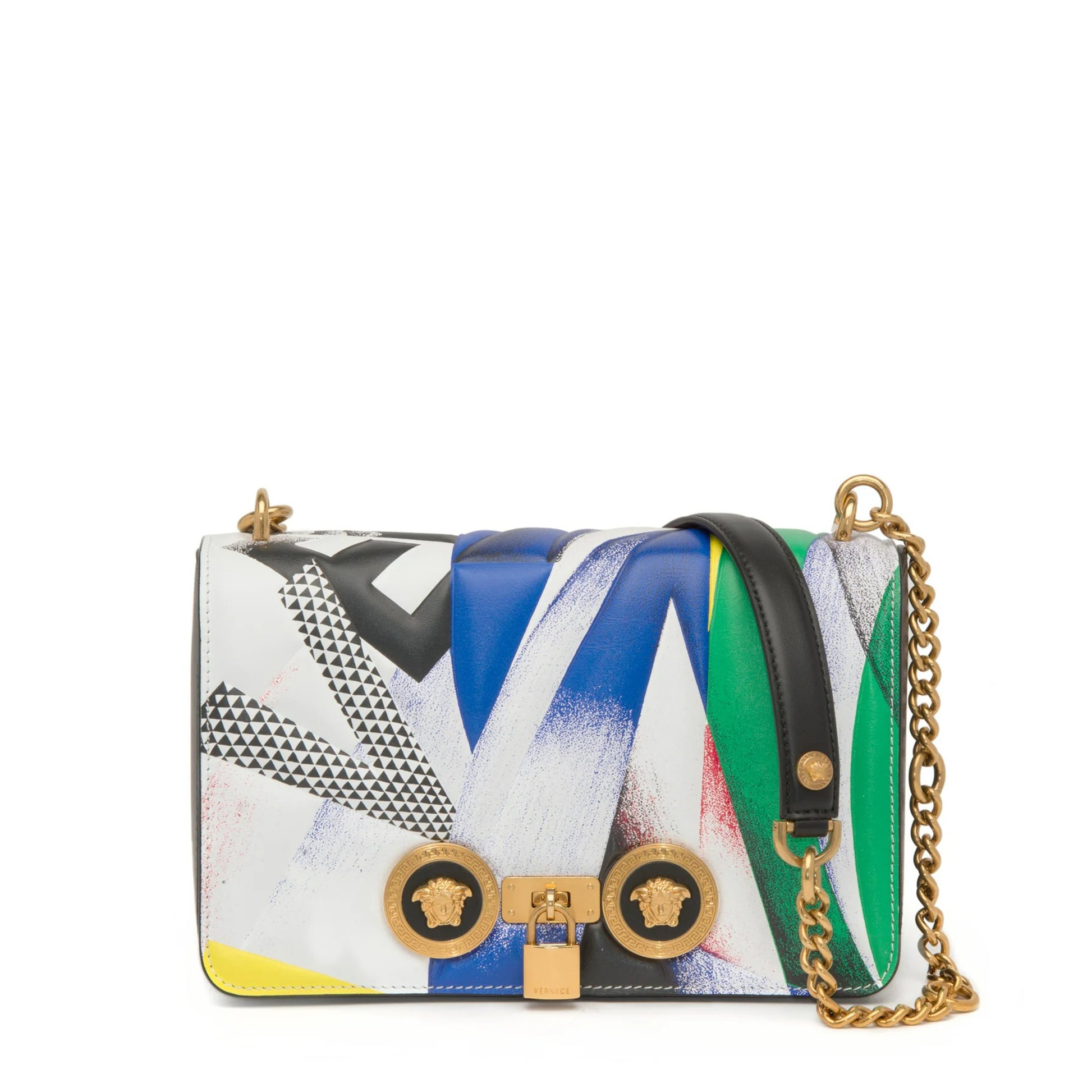CARTERA DE PIEL MULTICOLOR, CORREA DE CADENA DESLIZANTE, LLAVERO EN PIEL COLGANTE, 2 HEBILLAS PEQUEÑAS ¨MEDUSA¨ Y CIERRE DE SEGURIDAD CON CANDADO