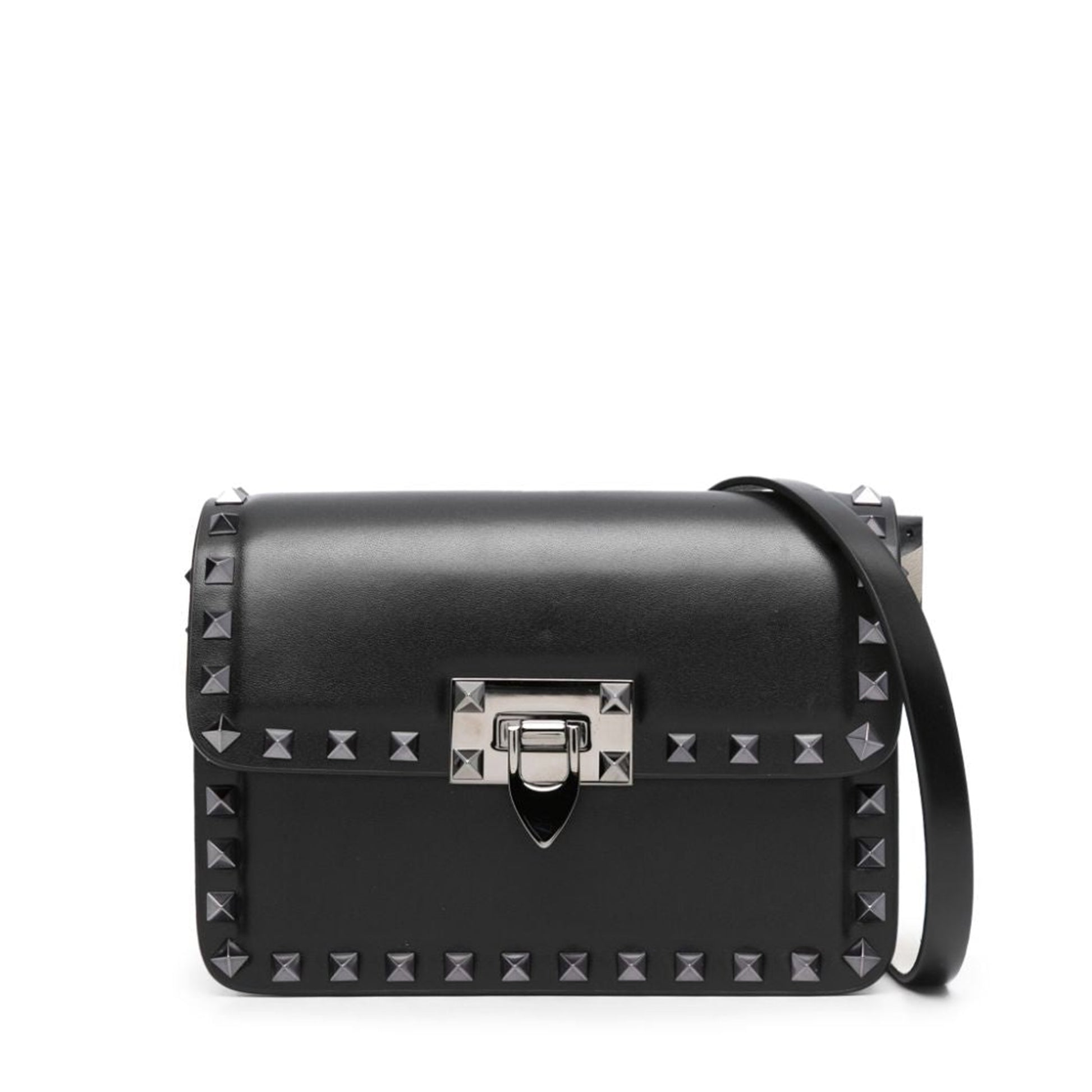 BOLSO ¨ROCKSTUD¨ EN PIEL NEGRO, CORREA REMOVIBLE PARA UTILIZAR EN CRUZADO, CIERRE DE SEGURIDAD GIRATORIO, Y TACHUELAS DECORATIVAS TAMAÑO PEQUEÑO