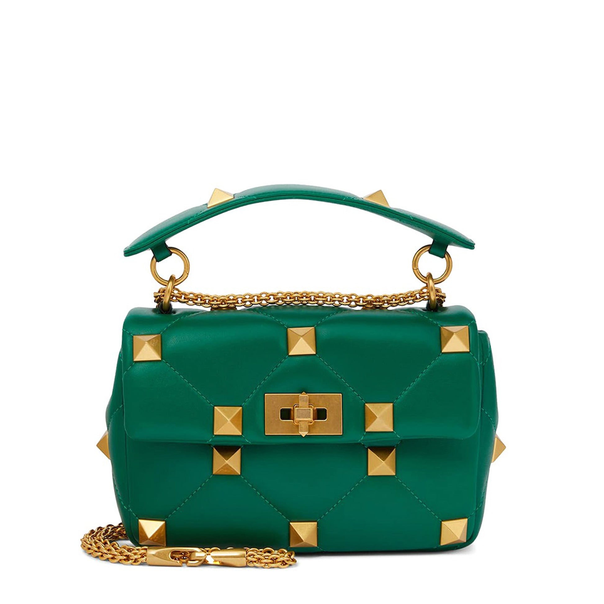BOLSO ¨ROMAN STUD¨ EN PIEL VERDE ACOLCHADO, CORREA DE CADENA REMOVIBLE PARA UTILIZAR EN HOMBRO, CIERRE DE SEGURIDAD GIRATORIO, ASA UNICA EN PARTE SUPERIOR PARA LLEVAR DE MANO, Y TACHUELAS DECORATIVAS TAMAÑO MEDIANO