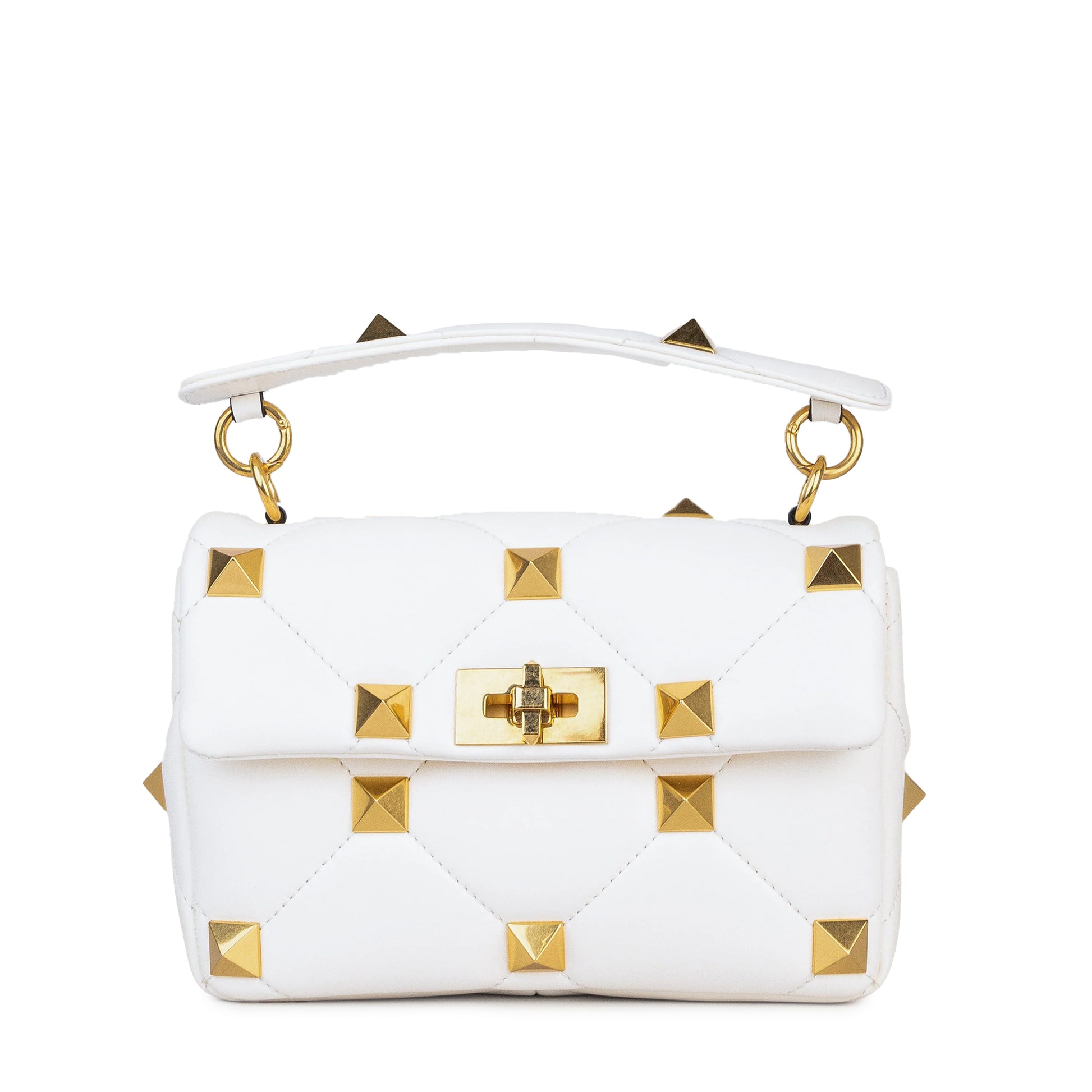 BOLSO ¨ROMAN STUD¨ EN PIEL BLANCO ACOLCHADO, CORREA DE CADENA REMOVIBLE PARA UTILIZAR EN HOMBRO, CIERRE DE SEGURIDAD GIRATORIO, ASA UNICA EN PARTE SUPERIOR PARA LLEVAR DE MANO, Y TACHUELAS DECORATIVAS TAMAÑO MEDIANO