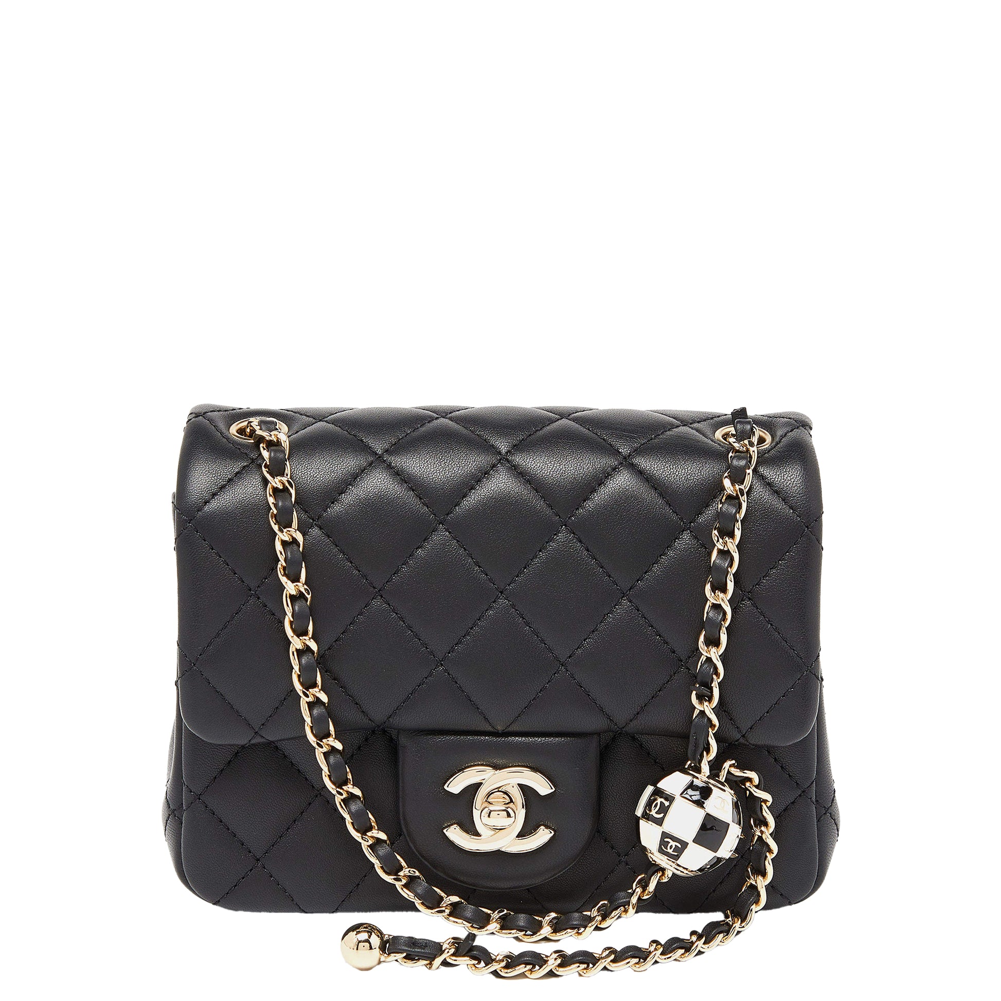 BANDOLERA CHANEL DE PIEL NEGRA CON TIRA DE CADENA DORADA CHARM LATERAL CON ESFERA BLANCA Y NEGRA Y LOGOTIPO DE LA MARCA EN EL BROCHE COLOR DORADO