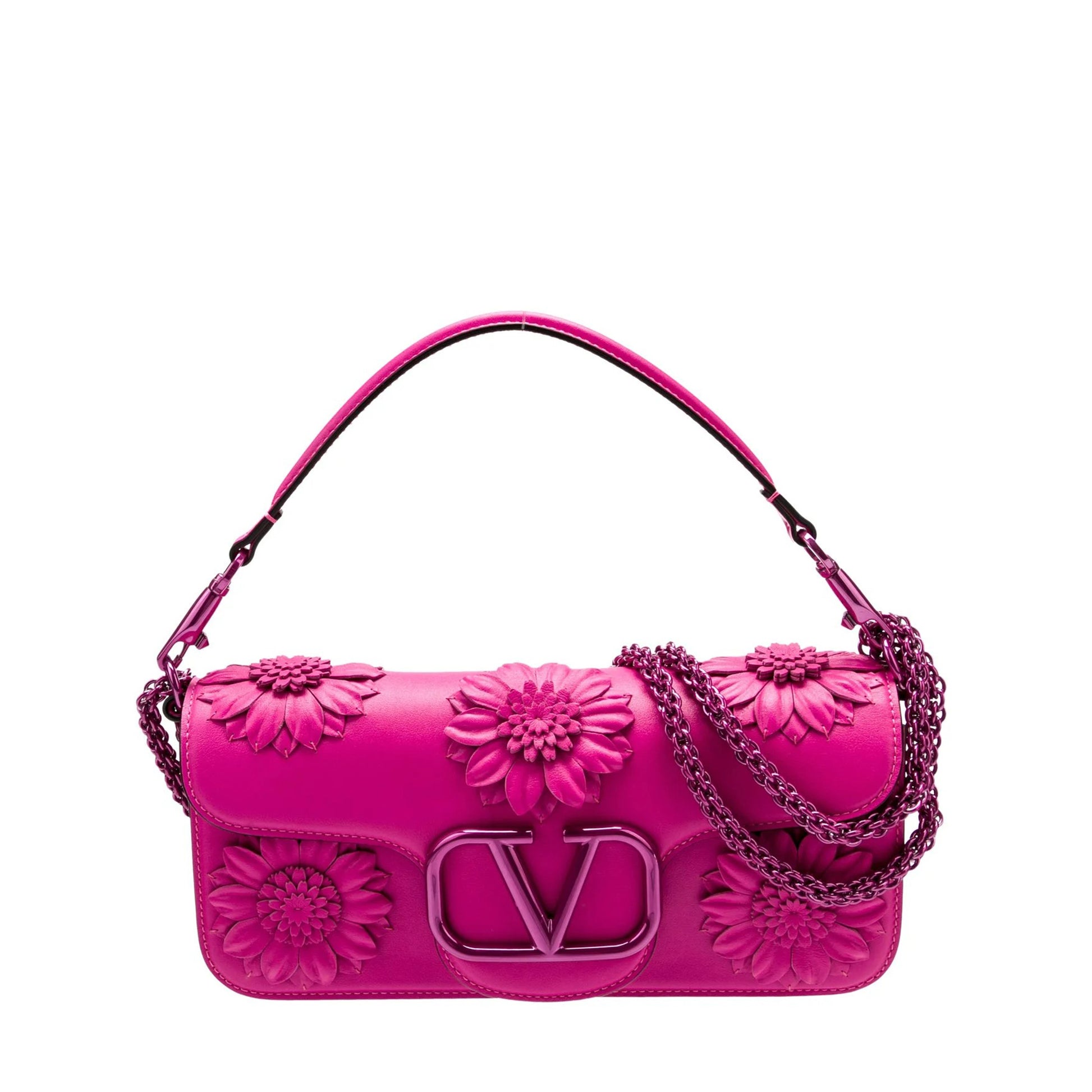 CARTERA DE PIEL FUCSIA CON FLORES EN RELIEVE PARA DAR UN TOQUE ROMÁNTICO Y BROCHE DE LA MARCA