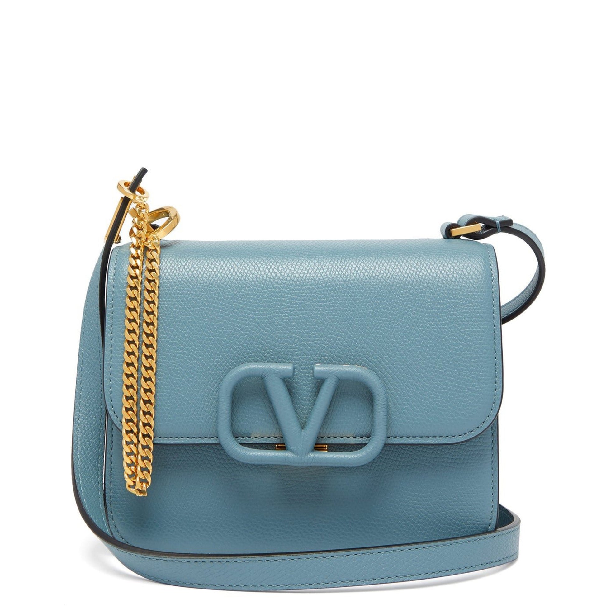 Bolso de hombro Vsling pequeño de Valentino. Fabricado con piel de becerro granulada de primera calidad en un atractivo tono azul, el diseño incluye una práctica correa de piel con cadena dorada en un extremo y una cerradura en V forrada en cuero.