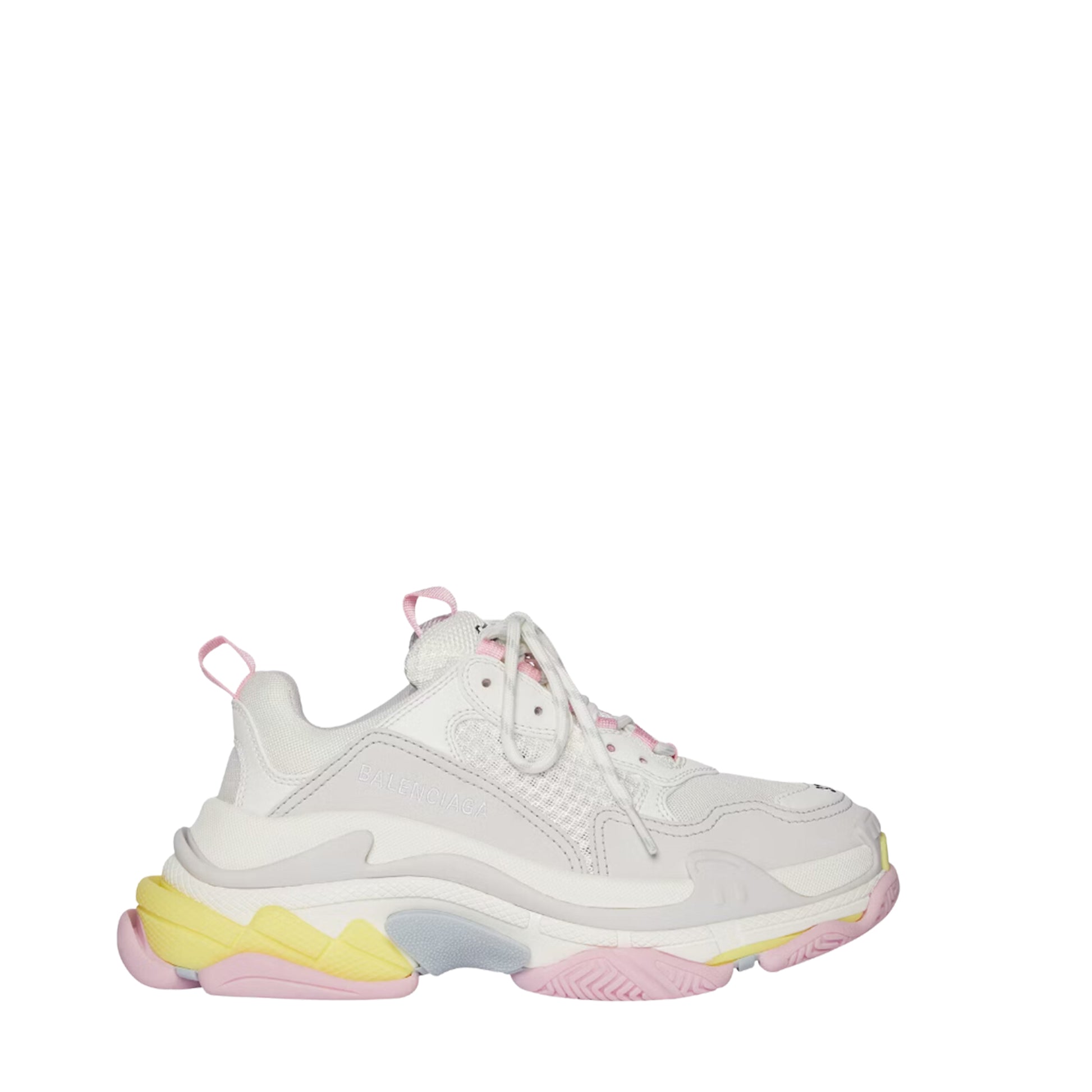Zapatos deportivos combinación de texturas y colores suela amarilla, rosa y gris y tela blanca