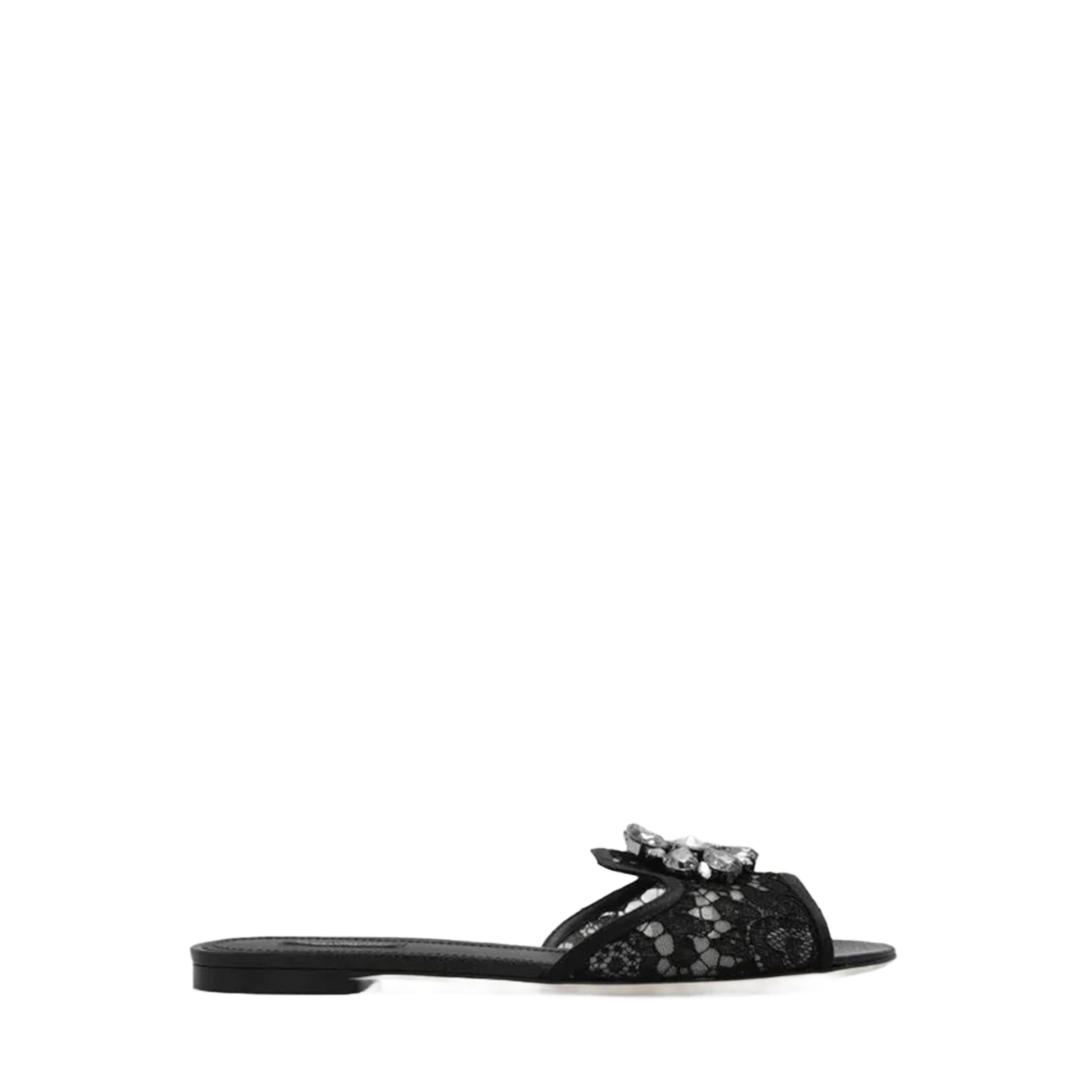 SANDALIAS DOLCE GABBANA DE TELA DE ENCAJE NEGRO CON DETALLE EN PIEDRERIA SIMULANDO UNA FLOR EN COLORES NEGRO Y PLATEADO